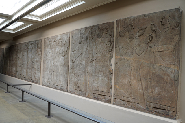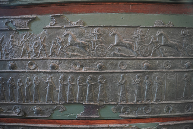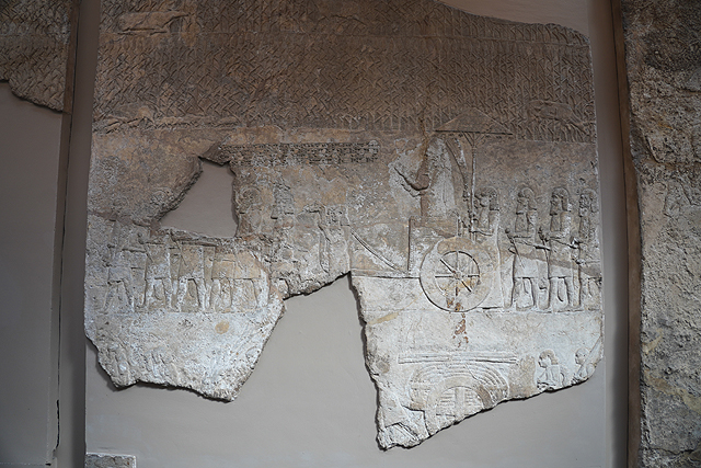 這樣的都城,位處西南的王宮不免精心裝飾,牆側同樣佈滿雕板。可惜的是,相較「尼姆魯德」那間,此廳所展的狀況不太好,幾乎都有大幅缺損。即便刻描的人事物更精緻,得近距離細辨,再加上自行補完的能力,才能建構起全貌。