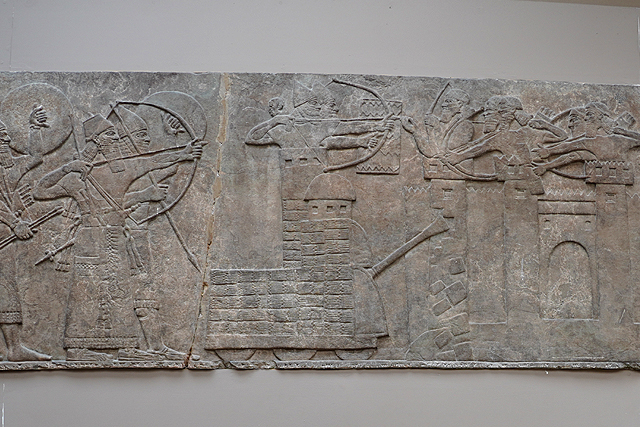 從網路圖看,裏頭主題有二,「辛那赫里布」的「Lachish」攻城戰,以及「亞述巴尼拔」的獵獅。前者攻打的是當時「猶大王國」僅次於「耶路薩冷」的第二大城,城池設計固若金湯,然到處攻掠的亞述戰力跟經驗都強多了,於箭矢的掩護下,他們築坡接近城牆,躲在柳條盾牌後施以攻城槌。