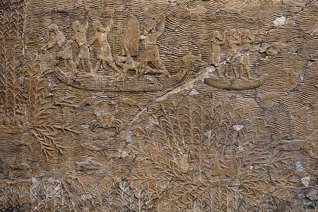 左列的主題比較雜,先是以長河為景,綴點渦卷與魚蝦,舟隻間有對逃匿巴比倫人的抓捕。再過去的隊列為清點戰利,物品之外,竟還有人頭堆。但也似摻雜當時對戰敗國的強迫移民,避免屠城積累民怨,又可讓俘虜失根,在與他族通婚後淡去仇恨。