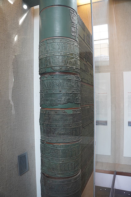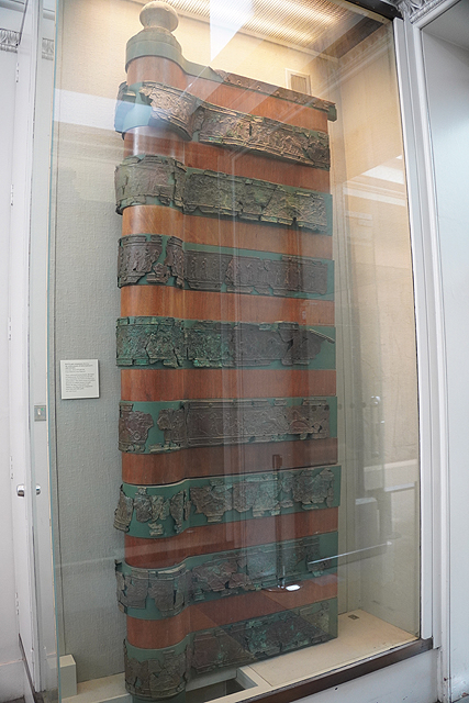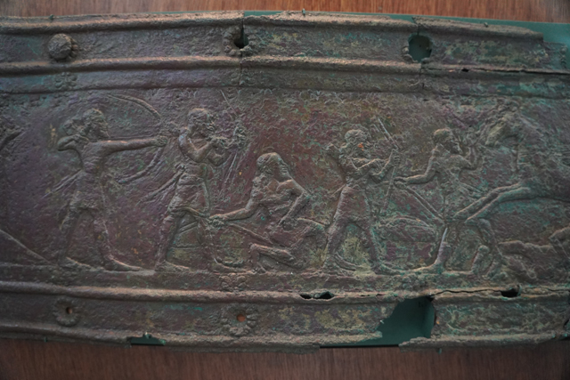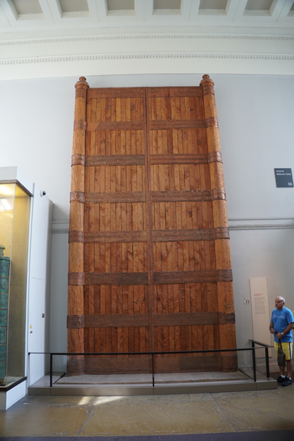 穿出到另側的Room6,這兒除了一對獅身「拉瑪蘇」,亦有一座巨大的「Balawat Gate」,是「亞述那西爾帕二世」兒子在王都外圍另建的宮殿大門。原物為木質,理所當然早風化,留存的是釘鑲在上頭的青銅帶扣。這些帶扣被玻璃遮護起來,遠望殘破,趨近卻能見列陣的小人兒進軍、破城、獻祭,以雕鑄展現此王戰功。館方挺用心,怕大家看殘片沒感覺,還復刻了一座完整大門,搭配「拉瑪蘇」頗具氣勢。