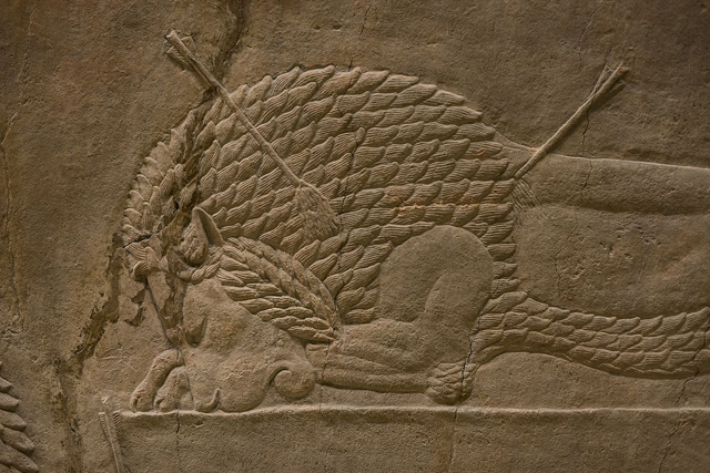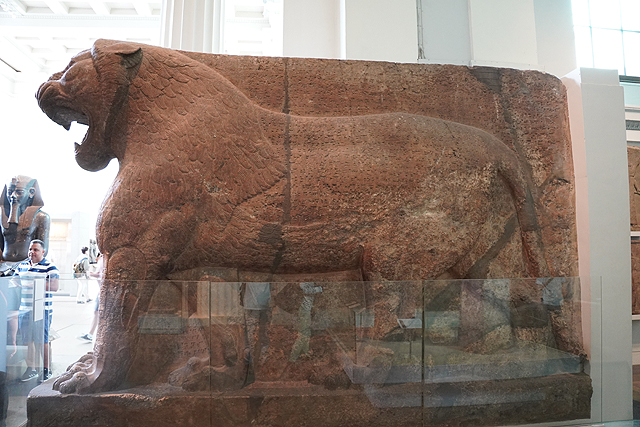 轉過身,這兒有與「拉瑪蘇」相似功能,阻止邪惡進門的巨大雄獅,衛守的是「尼姆魯德」的「戰爭女神Ishtar神殿」。相對的大塊雕板,則來自「Ninurta神殿」,這神除了掌管戰爭、農耕,也是「尼姆魯德」的城市保護神。儘管雕版已斑駁,仍可辨出右邊的「Ninurta」,他擁有兩對翅膀,手持閃電,正在追殺逃跑的兇猛翼獸。