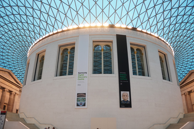 「大英博物館」正門在南側,由於多數遊客直覺從那進,又須過安檢,運氣差就得浪費不少時間,我按網路建議從後門,果然不需排隊,一下就見到標誌性的「伊莉莎白二世中庭」。它以圓柱狀建築為心,玻璃天穹散射罩覆,據稱是歐洲最大的室內空間。