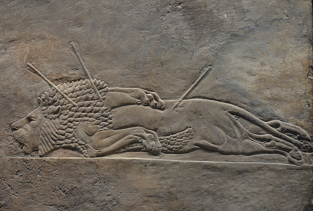 至於另一部分的獵獅,主角換替成孫子「亞述巴尼拔」(Ashurbanipal)。其任內建了西亞第一座系統性圖書館,收集諸多泥板文獻,包括知名的《吉爾伽美什史詩》,規模要到數世紀後的「亞歷山大圖書館」才被超越。藝術上也頗具經營,從廳內展示的雕板可以窺知。當年的國王不是只把獵獅當娛樂,除了展現武藝,也是種為保護人民而戰的象徵。呈現的場景挺多樣,戰車上的遠射、面對撲擊的近戰刺殺,對獅子的刻描是其中精華,從出籠的咆嘯邁步、憤怒奔躍,到身中亂箭後的漸漸癱倒,垂死的形樣栩栩如生。