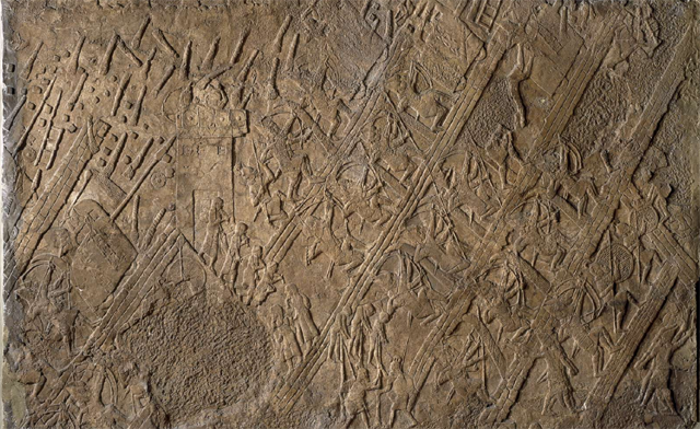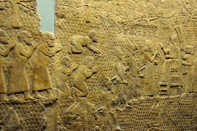 圖刻敘事如流水,殺伐間便轉換至城破。接續可見士兵端著戰利品、居民攜家帶眷被迫遷徙、城中高官被活活剝皮。「辛那赫里布」自不會缺席,他帶著侍衛坐於高丘,傲望俘虜的跪伏。這段紀錄在舊約也有,僅視角不同,文中敘述「辛那赫里布」在那之後劍指「耶路薩冷」,令當時的猶大王「希西家」驚懼不已。幸好亞述人在城下出言不遜,惹得耶和華以神威擊殺軍兵十八萬,才免於此難。