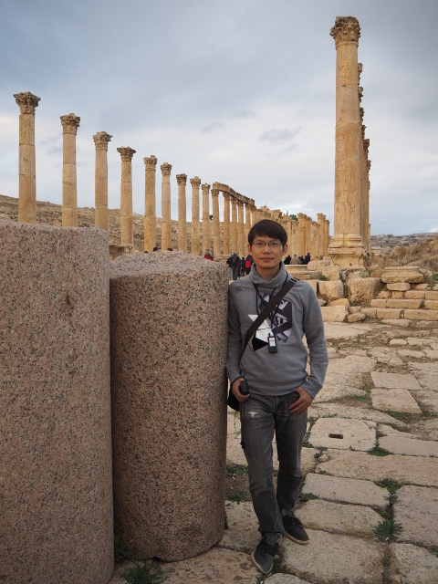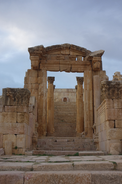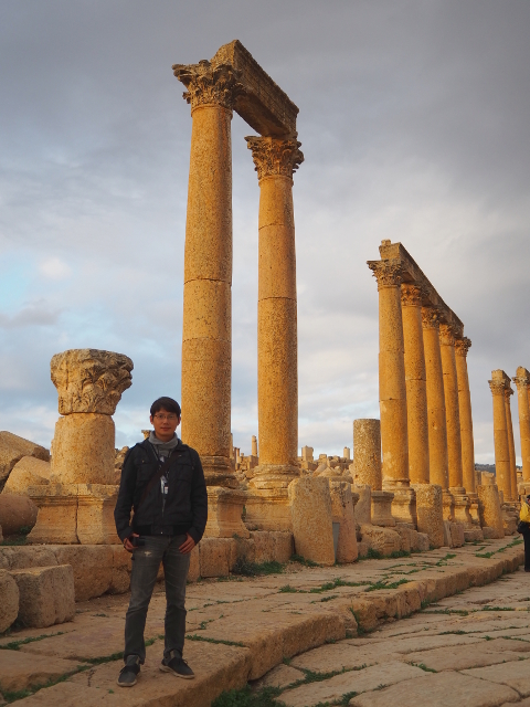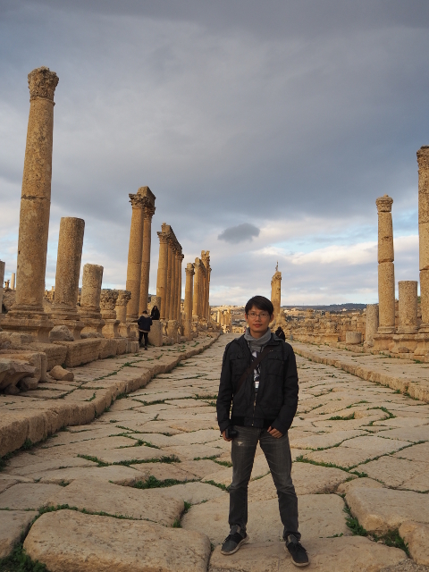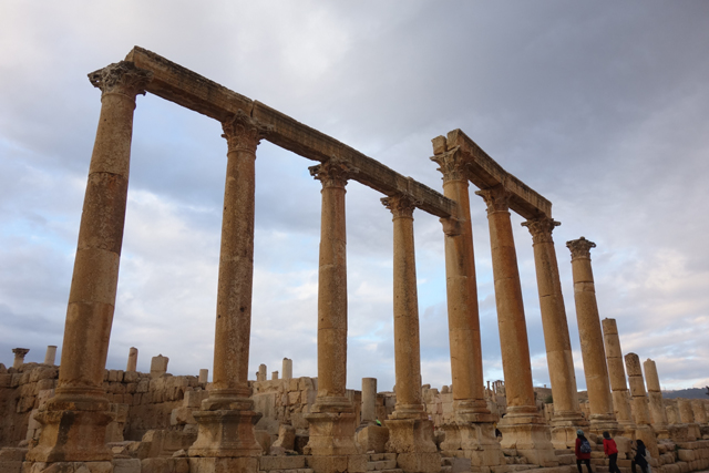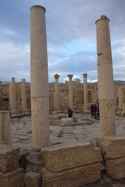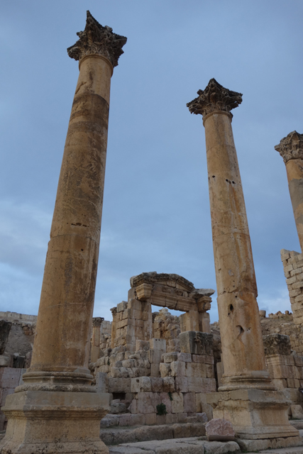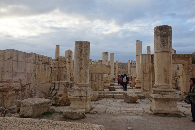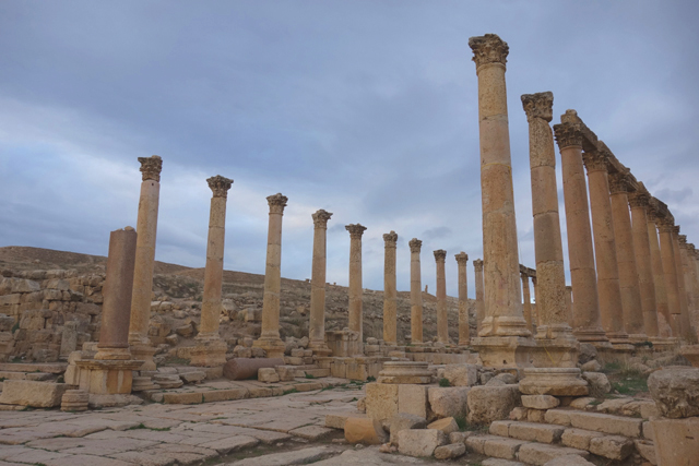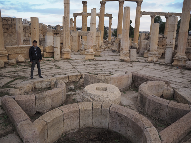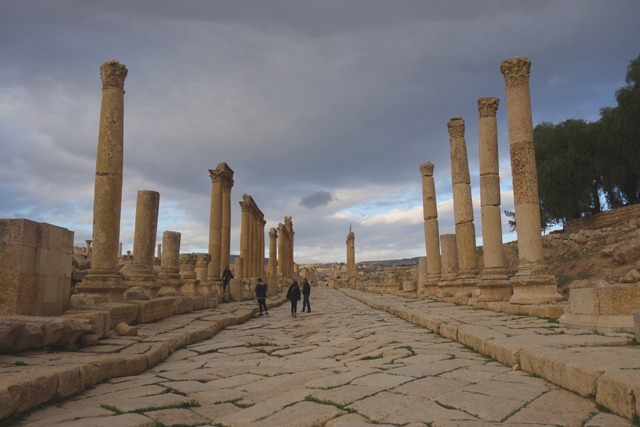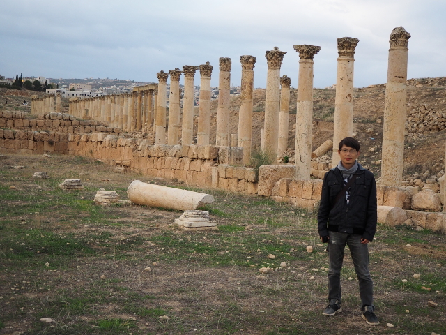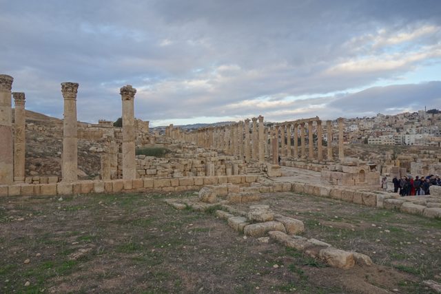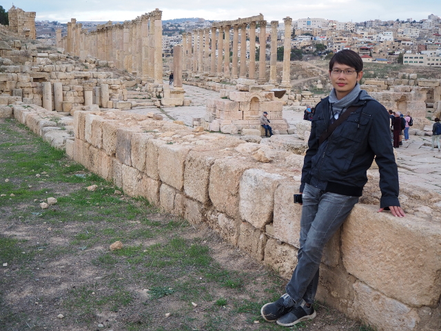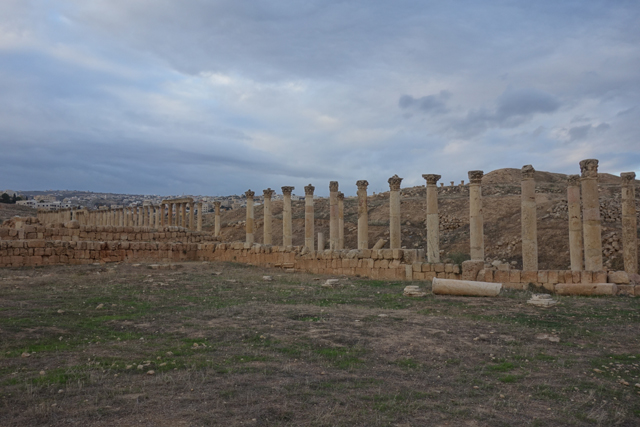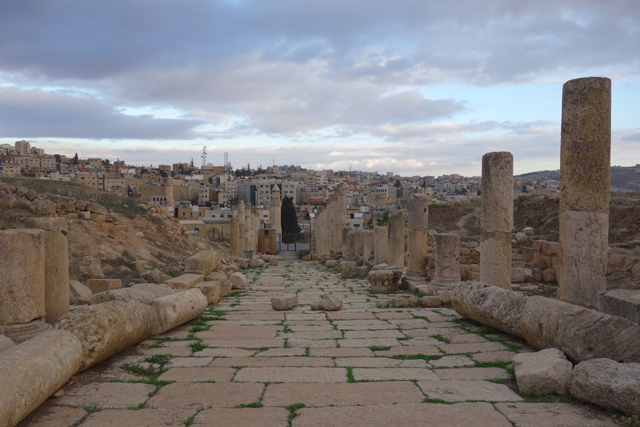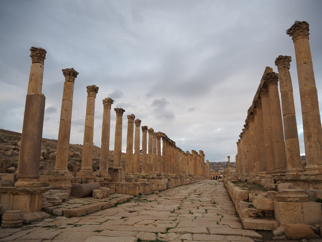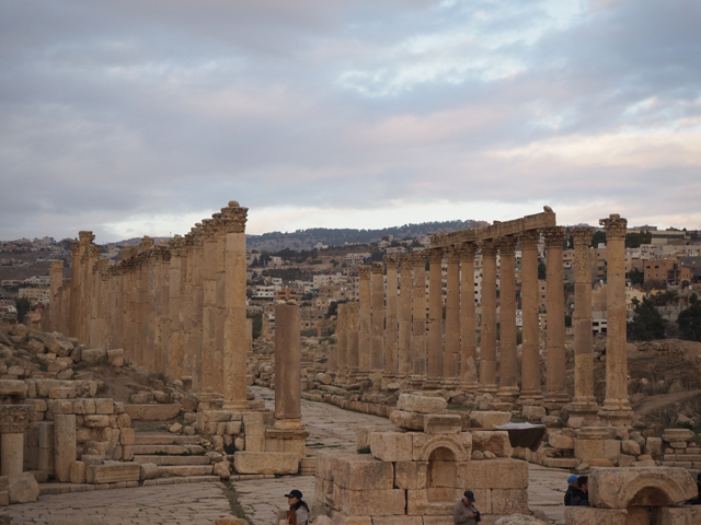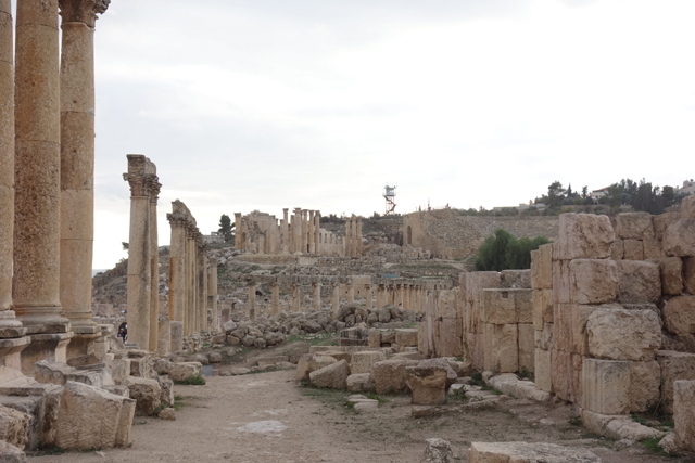 在「橢圓廣場」待了一陣,大夥走入「傑拉什古城」的「南北大道」(Cardo)。這樣的規劃很多羅馬轄城都有,前幾天我們也在「耶路薩冷」見識過,然而由於一邊是山坡,一邊為長河,這條大道被迫有些歪斜,略朝東偏。這無損其氣勢,長達八百公尺的它接往另端的「北門」,兩側皆是列柱,列柱隨時代作了幾次變更,不僅柱頭由典雅的「艾奧尼克」式換成翻捲繁複的「科林斯」式,也旁移擴增了路幅,順勢加添了下水道。在某些還原圖中,列柱還成為騎樓的一部分,有人眾在簷下熙來攘往。