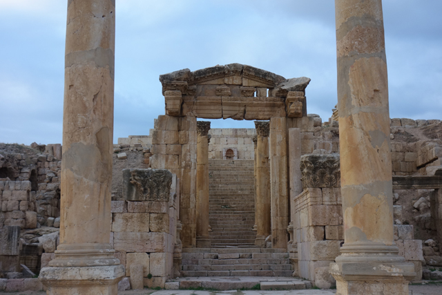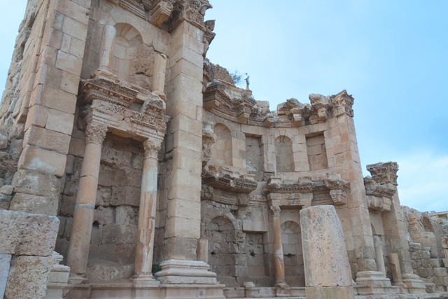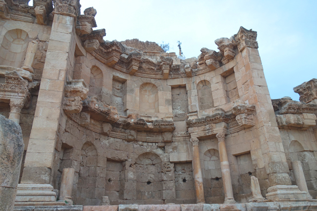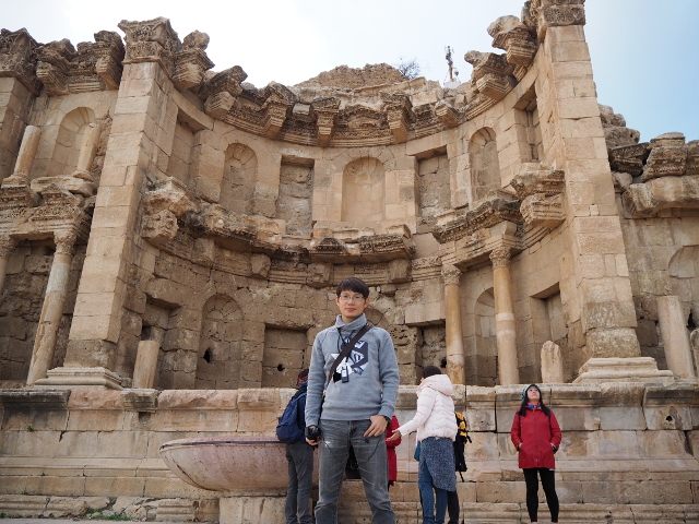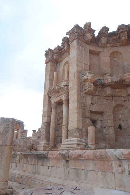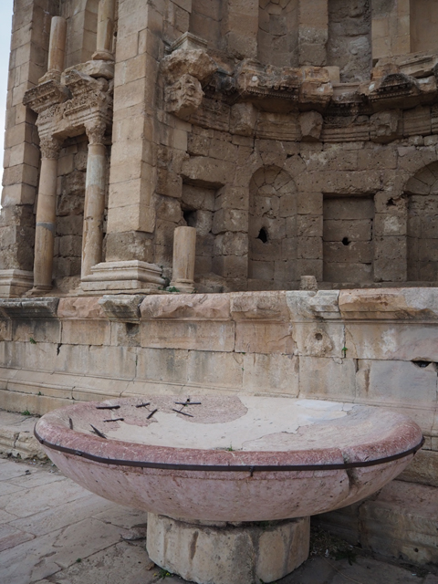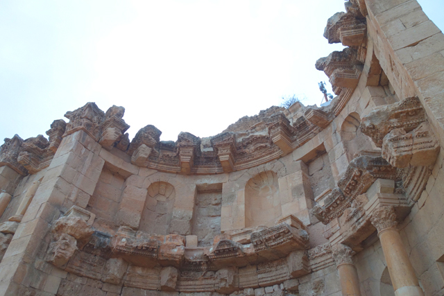 「Cathedral」的隔壁是城內挺重要的設施「Nymphaeum」,也就是兼具裝飾的飲用水泉,這類建物在「凱薩利亞」與「佩特拉」雖也有,卻只見池緣,剩餘立面有限,「安曼」那座則與我無緣,能在此城見到相對完整的「Nymphaeum」,很令人開心。它高築的背牆以方柱隔分為三區,兩側平展,中處內凹,方整或弧頂的龕室交互接併,儘管右端崩塌嚴重,讓其失了勻稱,仍有諸多細節值得端賞。龕室柱頭使用了「科林斯」式,層層翻捲的葉紋自顯繁麗,橫楣的團花以不同樣式拼組、堆疊,彷彿在荒岩中仍要持續開綻。
