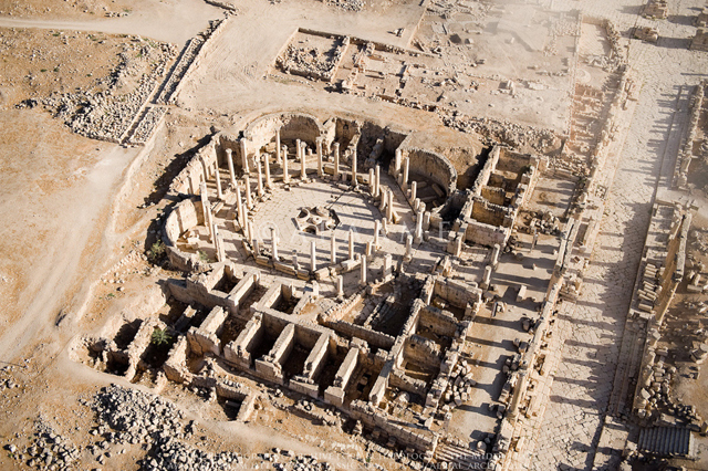遺憾的是,經過天災摧殘,現今可見的,也僅剩底座和側面以扇貝為頂的弧龕,來自埃及的粉紅大理石、曾經豎立的人像都消失於歲月,座上四根細柱擎舉華蓋的身姿,只存在還原圖裡了。從圖上的描繪,這兒當年應為黃金地段,環廊後皆是人客如織的店家,且目前仍能辨出隔間。不過這樣的視覺設計到了伊斯蘭人手裡,似乎變了調,為了賺錢,商攤併吞了人行道,也往圓環蠶食,擠擁著龍蛇雜處的哄鬧感。