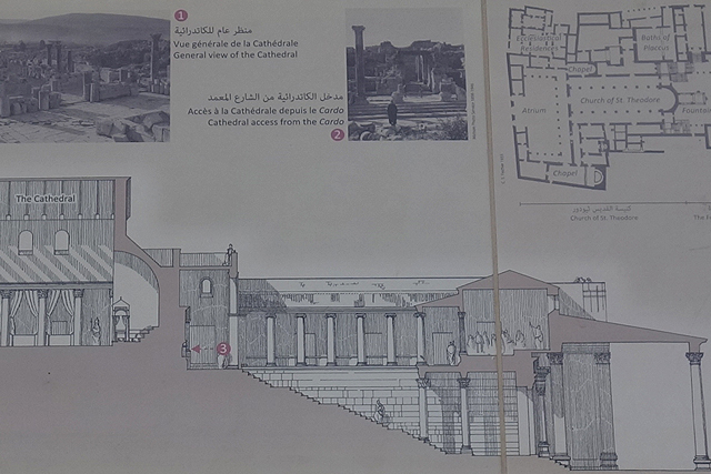 穿過「東西大道」往北走,沒多遠左手邊出現另個顯眼門面,支著拼湊回去的綴邊山簷。望了進去,裏頭是兩列立柱劃出的長階道,感覺應是棟重要建築,偏偏階頂長牆橫擋,僅有孤單的弧頂龕室在那俯瞰,讓人窺不出究竟。導遊目不斜視,顯然是沒打算帶進解此疑惑,迫得我趕緊去讀說明板。它被稱為「Cathedral」,似乎挖掘之初因其格局以「教堂」稱之,之後就沒作進一步更新了。而在更早的羅馬時代,這裡本是敬奉酒神「戴奧尼索斯」的神殿,以壯偉立面勾人從街仰望。合理地推想,將其替代的教堂也該有著類似概念,然教堂多是坐東朝西,若要按規制砌建,就得以背側與眾人相見,猜測當年的設計師應很傷腦筋。