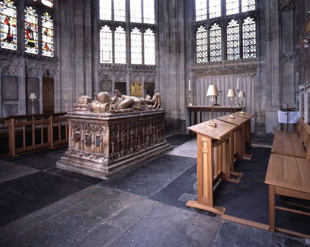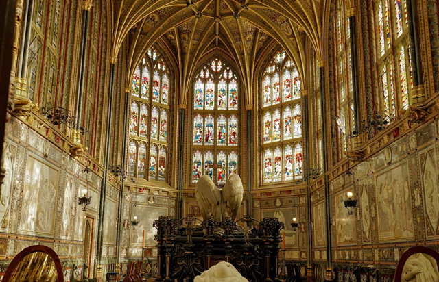 如同「西敏寺」那處是「巴斯騎士團」的儀式會堂,這兒也與「嘉德勳章」密切相關,每個座席的綴飾都代表勳章主人家系,就算去世了,仍會在背板留下徽牌。不過身為教堂核心,不免成為諸王的長眠地。主導改建的「愛德華四世」就搶得高壇北側的精華區,下方為棺塚,附有紋路花俏的鐵籬門,上方為追思堂。可惜經過「內戰」暴民們的破壞劫掠,目前棺塚已為近代之作,倒是追思堂的兩座凸窗仍瑰麗著,有繁複木雕的那座是「亨利八世」為第一任妻子「阿拉貢的凱瑟琳」所建。喪夫後的「維多莉亞」變得孤僻,也常利用此間盯望彌撒。
