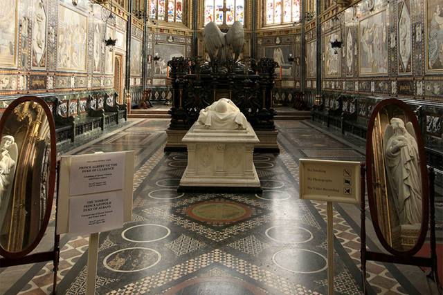 不過最具規模的當屬「維多莉亞」的丈夫「阿爾伯特親王」,最東端的尾堂整個變成他的紀念廳。這區最早是獻給「懺悔者愛德華」,歷經好幾任王的修建,「亨利七世」曾打算在這長眠,後來改去「西敏寺」。除了「亨利八世」,「查理二世」也想將父親「查理一世」挪來,結果計劃都胎死腹中。似乎愛情還是最大的動力,「維多莉亞」請來有諸多教堂改造經驗的「喬治·吉爾伯特·史考特」,於是環牆都覆上入色的大理石板,主壇以耶穌復生為核心,週邊藉舊約故事帶出親王美德,往上是花窗。天篷也極盡華麗之能事,如成列樹傘燦耀開散,間隙填以端持徽印的人像及繁紋馬賽克。