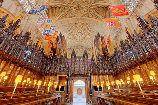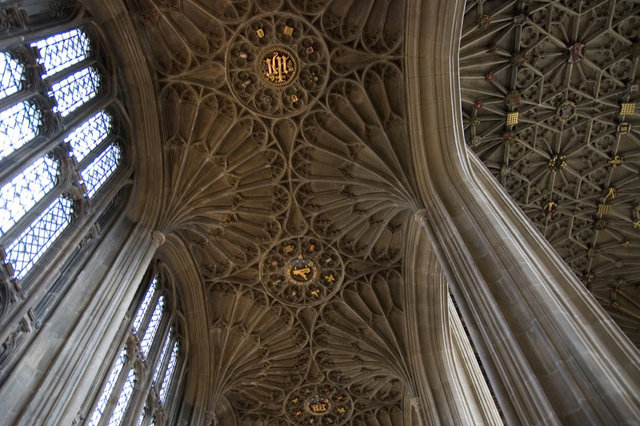 抬頭望向最勾人視線的天篷,那兒混用了兩種拱肋裝飾技法,中廊的先如泉噴吐,而後枝狀岔生成星芒,側廊的呈扇葉,在交切中綻出繁花。纖瘦的立柱則帶著窗櫺彰顯「垂直式哥德」,讓午後的光照映入斑斕。西面主窗亦爭妍著,它堆疊了七十餘幅的君王與聖者,多數都是避過戰火的十六世紀古物。