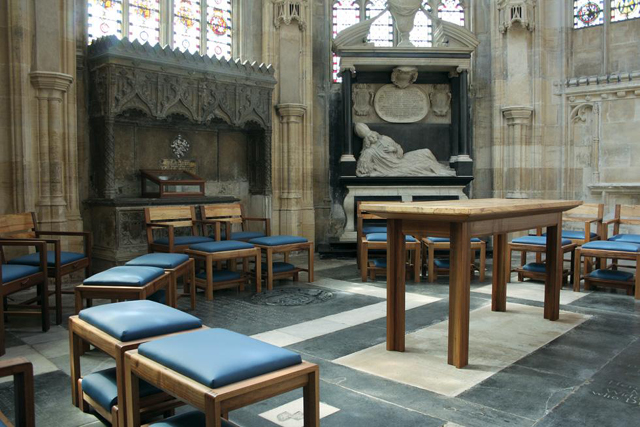 賞望了一陣,開始隨人流環走。先遇見的是洗禮盆,上頭刻飾了英國各區守護聖人及四福音書作者。而適才在外以為僅是裝飾用的邊角冠冕小塔,其實內嵌著小堂,西南角為「Beaufort Chantry」,西北的是「Urswick Chantry」。後者名字雖來由自「亨利七世」信賴的座堂主任牧師,抓縛視線的卻是裡頭「夏洛特公主」的紀念塚。她是「喬治四世」的獨生女,怎料卻難產而亡,王位也因此轉至堂妹「維多莉亞」。棺塚的雕藝相當精湛,底部以披巾呈顯逝者身形,上方是公主在兩位天使的護送下悠然飛升。