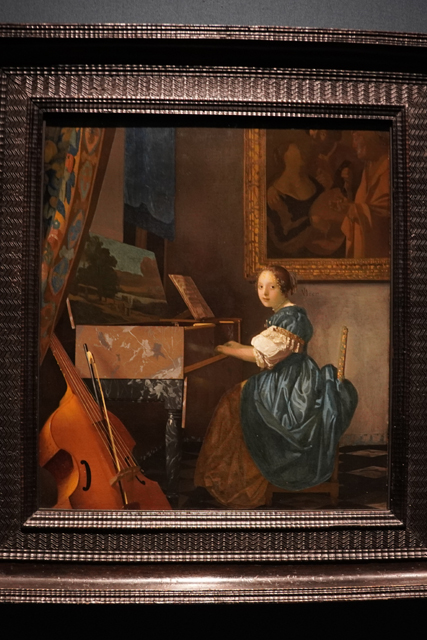 同時期的名家尚有「維梅爾」,前幾天在「白金漢宮」看過他的《音樂課》,Room16有另兩幅挺類似的作品,看起來他真的很喜歡描繪房裡女性的日常,讀信、彈琴、梳妝、備餐,並用側窗映入的光線營造氛圍。這兩幅有同樣裝扮的女子,鏡像構圖,又都在彈當時流行的「維金納琴」,顯然是成對的作品。乍看之下,很可能會將其當成肖像委託或寫生,但作者既是「維梅爾」自不會如此表面,通常畫裡出現的元素都有其影射寓意。