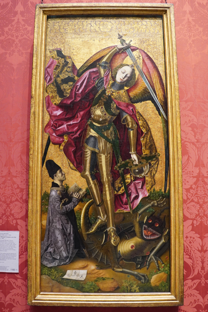 由「倫敦國家美術館」西翼往北走,會進入串接性質的小室Room15。這裡的畫家我都沒聽過,也因為偏早期,筆觸皆過於工整,但細節卻很驚人,不論背景、衣著、手上器物都精微勾勒。例如來自西班牙的「Bartolomé Bermejo」,就以《聖米迦勒戰勝邪惡》展現了畫工。盔甲的珠寶雕鑲、披風的織紋質料、翅翼的漸層用色、腳底的奇形怪獸,刻這麼一張不曉得花多少工夫。