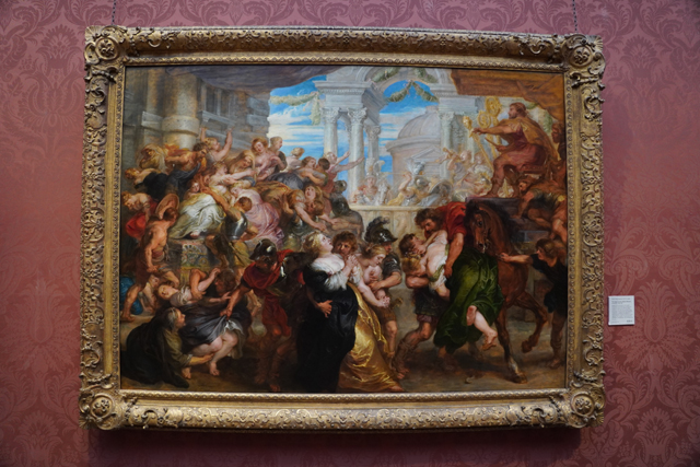 《掠奪薩賓婦女》在他筆下亦有戲劇化的展現,當高坐的國王「羅慕路斯」揮落手臂,便起始了這暴亂的一幕。華美殿閣裡婦女奔逃摔跌,驚慌中有著掙扎,就算跪地祈求也得不到回應,甚至還有士兵已止不住色心,掀了裙子便想硬來。一面盯瞧,一面也彷彿能聽見呼救聲。