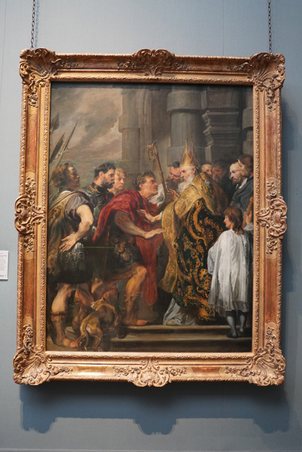 除了肖像,這兒也收藏了他的歷史畫《St Ambrose barring Theodosius from Milan Cathedral》。四世紀時羅馬皇帝「狄奧多西一世」為鎮壓起義,在「塞薩洛尼基」屠殺了萬餘人,憤怒的米蘭主教「聖安布羅斯」因此阻止皇帝進入大教堂。這主題「魯本斯」曾畫過,卻是由仍為助手的「范戴克」完成,驚人的是當時他才十多歲。眼前這幅為數年後他的重繪,我翻了網路圖出來,主教的威嚴面孔與華麗衣裝幾乎一樣,但皇帝表情更生動了,眉目顯得陰騭,隨從們也倍加倨傲。