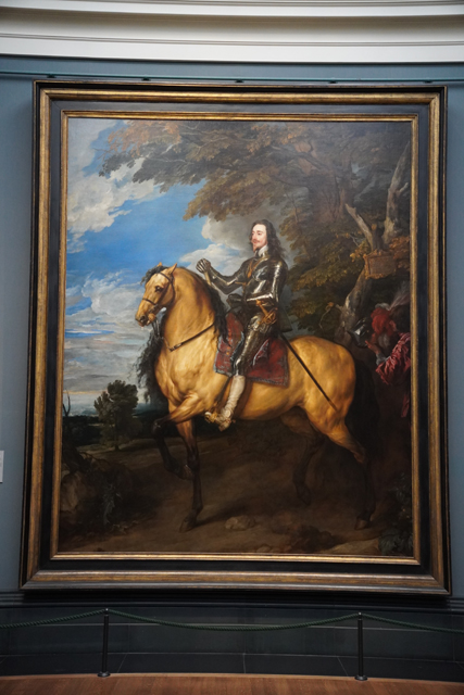 然說起肖像畫,應是他的弟子「范戴克」更有名,因宮廷畫師的身分留下不少傑作。他獨佔了Room21,一踏進便能見巨幅的「查理一世」騎馬步過對牆。這很令人聯想早上於「溫莎城堡」所見,只是那幅為迎面,此作為側向,雖是鎧甲勁裝,氣氛卻更閒適,挪去彰顯王權的凱旋門與陪侍,彷彿正於鄉野遊晃。這也是「范戴克」的特色,將肖像與風景結合。但既是描繪君王,自不會那麼簡單,據說對壯碩駿馬的駕馭代表對國家的引領,樹冠後的蒼茫雲色亦是種不可拂逆的威權。即便現在看來挺諷刺,因為十年後他就人頭落地。