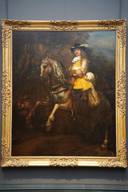 至於在同時期發光的「荷蘭黃金時代」,最被眾人所知的應屬「林布蘭」了,鄰近的Room22是他的表演場。彷彿要跟「范戴克」作呼應,這邊也有張大幅騎馬像,只是主角換替為商人「Frederik Rihel」。相較起來,「林布蘭」的筆觸顯然更率性,將五官衣飾精微勾描後,馬匹便僅粗獷點抹,背景大量渲染。這滿符合他給人的印象,或以濃重色彩,或用反差光影烘托情境。