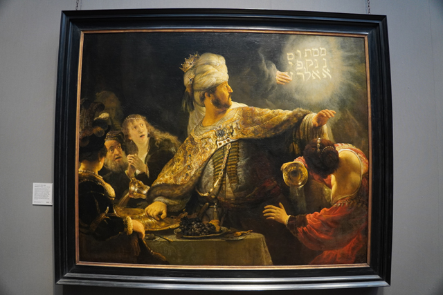 由於數量繁多,一幅年輕之作《Belshazzar’s Feast》外溢到Room24,雖不像《夜巡》那麼經典,同樣體現了他愛用的光影。這畫出自舊約,主角是巴比倫國王「伯沙撒」。他因宴會餐具不夠,取用了從耶路薩冷奪來的聖器,就在那一瞬雷聲劈響,上帝之手從霧中浮現,寫下「經過秤量,已顯你的虧欠」,接著,「伯沙撒」便暴斃而亡。畫中精微呈現國王身上的華麗繡紋與珠寶,但更令人印象深刻的是那帶著窒息感的密室氛圍,以及幻光映照下眾人誇張的驚愕。