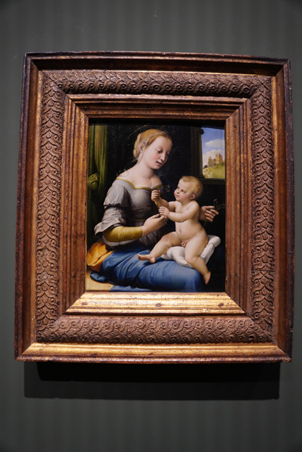 而《The Madonna of the Pinks》就是他標誌性的秀麗聖母,畫名來自耶穌手中的粉紅康乃馨。這幅據說是受「達文西」《柏諾瓦的聖母》啟發,構圖也的確相像,即便如此,聖母那粉柔的膚色光暈仍惹人盯望。只可惜天妒英才啊,若他能像其他兩位長壽,以其進化速度,肯定會留下更多經典。