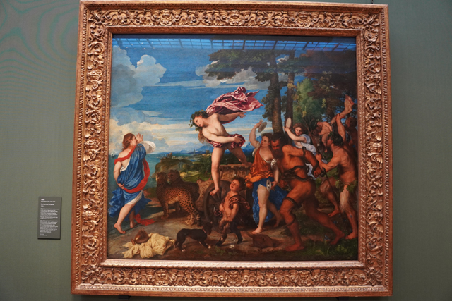 但這之間最被推薦的是《酒神與阿里阿德涅》,後者為克里特島的公主,曾幫忒修斯除去牛頭人,卻被始亂終棄,在畫面左側能見無情人乘船遠去,公主伸手欲追。就在此時,酒神領著隊伍從印度凱旋行來。阿里阿德涅轉頭愣愕,酒神從戰車癡迷下躍,「提香」讓這一見鍾情顯得格外生動。