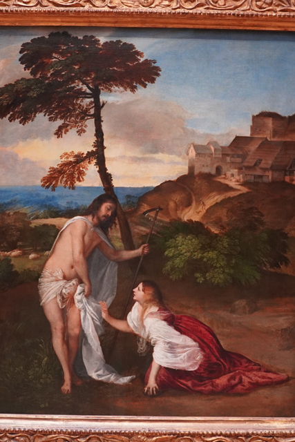 在這兒他依然有宗教性質的作品,像《Noli me Tangere》,便描繪了耶穌復生時與「抹大拉的瑪麗亞」的相會。畫名所述的「別碰我」搭配巾袍像被扯落的動作,初看令人莞爾,其實是耶穌在表達他不再是可隨意親近的凡人。這幅雖為「提香」年輕時的創作,色彩運用已顯天賦,光是白色就表現出諸多質感。