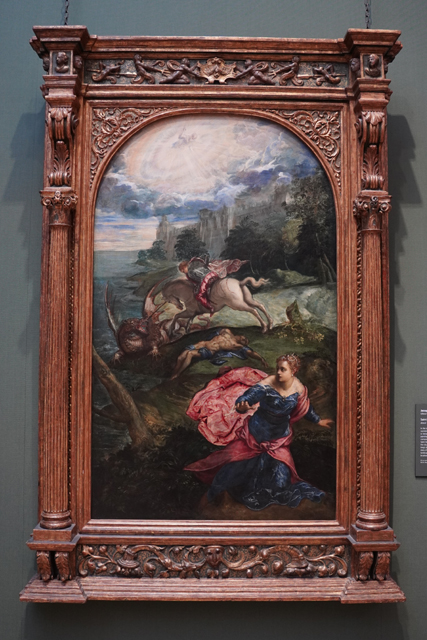而在Room9被排擠的「丁托列托」,有幅《聖喬治屠龍》流落至此。這幅滿特別,一般是把聖喬治置於焦點凸顯英武,他卻將其擱到背景,讓驚慌逃跑的公主成為主角。因此儘管人物生動,神之光暈帶來戲劇性,待在祭壇的時日據說頗短暫。