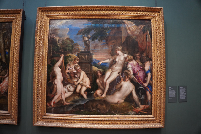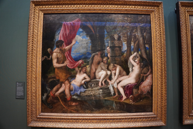除了這幅,鄰近另有取材自「奧維德」《變形記》的作品,為三十年後來自西班牙「菲利普二世」的委託。其一是《戴安娜與卡利斯托》,身為水仙女的後者本為前者所愛,卻被朱庇特染指,畫中所繪的,就是起疑的女神在狩獵完命其脫衣沐浴,揭露她已大腹便便的那刻。