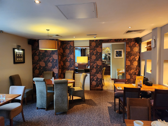 抵達的時候已經是晚上,前一星期每天都豔陽高照,也不知是地域關係抑或鋒面來襲,出了車站,綿雨滿空飄落,得狼狽拖著行李微微爬坡衝去旅館。由於不算知名觀光景區,旅館的選擇不多,幸好還有間連鎖的「Premier Inn」。而冷門也是有其好處,房間大又比倫敦便宜,餐廳佈置也沒馬虎,可惜待一晚就要走了。