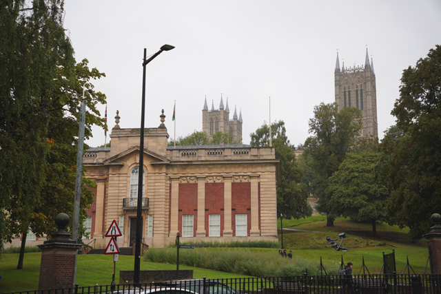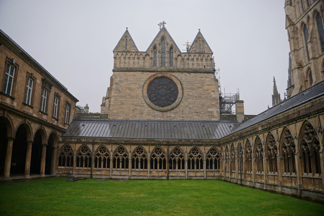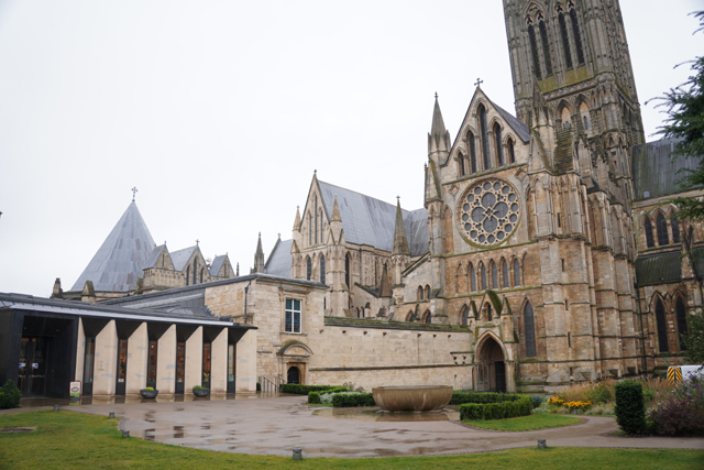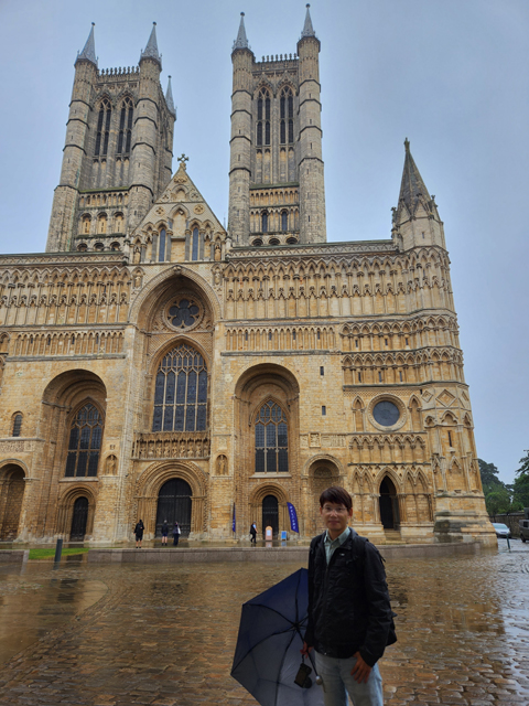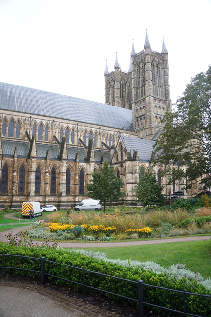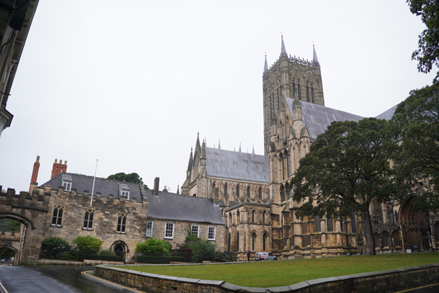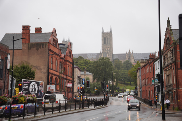 舒泰睡過,本期待老天能轉換情緒將預報翻盤,哪知醒來走到窗前,外頭仍是整街的煙雨濛濛,儘管嘆息,吃完早餐還是得按原訂計畫,朝山坡的「林肯座堂」出發。一般路線都是從火車站起始,沿商街逛上去,由於旅館位置靠外圍大馬路,就不必拘泥,且一出門,遠方馬路拋彎處就是教堂偉立的形姿,林後側身成了翼展,中央塔朝空豎劃。這樣的景色有著召喚魔力,盯了幾許,便決定從這方向過去。