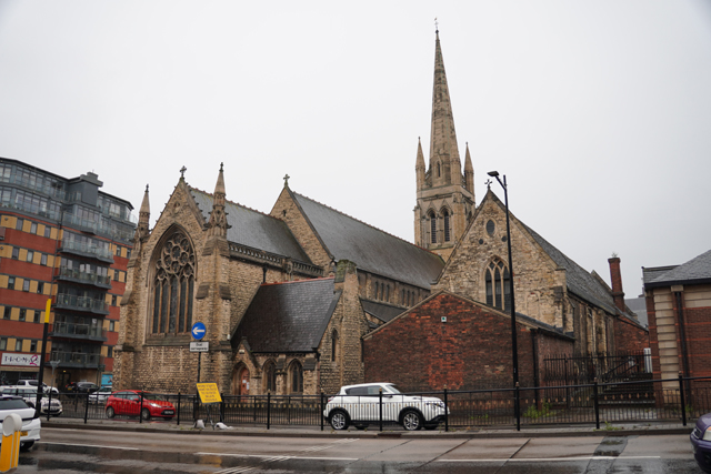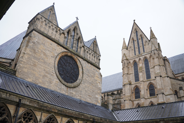 階路的盡頭是教堂側背,若以面積計算,它是英國第四大,僅次於「利物浦座堂」、「聖保羅座堂」和「約克座堂」。長長的尾堂又多拉出一對翼廊,令其稜線更顯嶔崎。最惹眼的自然是中央塔了,早年它還擁有尖頂令高度翻倍,以一百六十公尺霸佔最高建築的名號兩百年。怎料卻在十六世紀被暴風雨吹倒了,很讓人懷著嗟嘆,循塔身的挑尖拱窗、鏤空綴邊,朝灰空續畫。