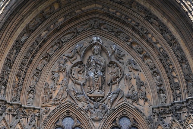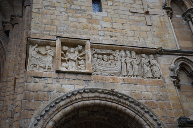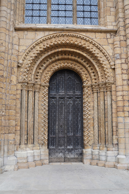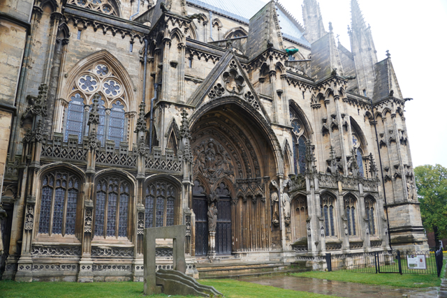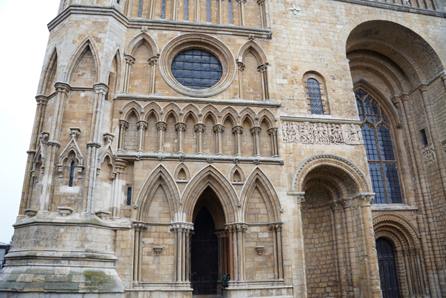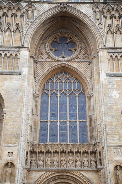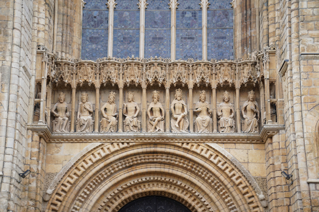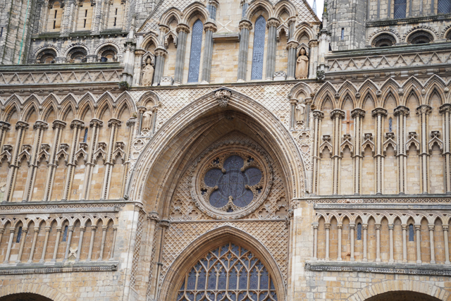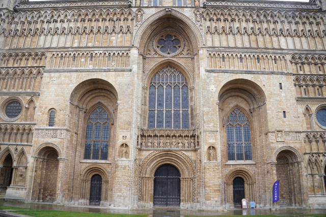 由於教堂歷史可追溯至十一世紀,立面不免歷經諸多改變。底層中央屬於諾曼時期,能從圓拱的使用作辨分,上頭的尖拱花窗為哥德時代的替換,再往外的簇密尖拱框,自然也是之後的添擴了。這橫展的設計頗特別,畢竟哥德追求縱向飛升,好像也因此招人詬病,但至少形成了記憶點。只是拍攝就成了難事,橫拍直拍都不對,得一直退至曾有長牆繞圍教堂界域的外門。