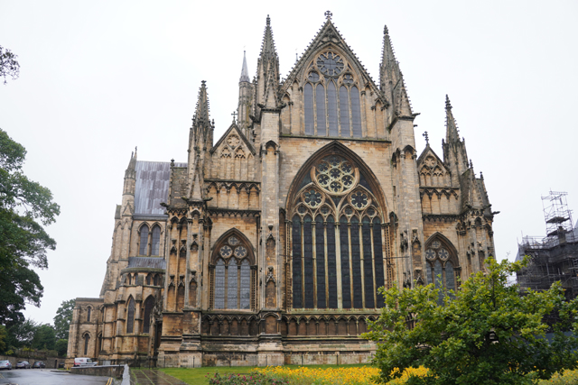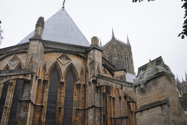 拚搏完,繞去尾堂後方被小黃花點綴的草坪,這東端的繁複感又更進階,中高側低的山形斜切,大面花窗堆疊,再加上炬塔參差、拱框連併,規格已贏過不少教堂主立面。可惜旁邊的「修士議事堂」正在維修,雜亂鷹架不免污擾了畫面。只能多走幾步,從北側相對清爽的角度,觀察它以飛扶壁護起的十角輪廓。