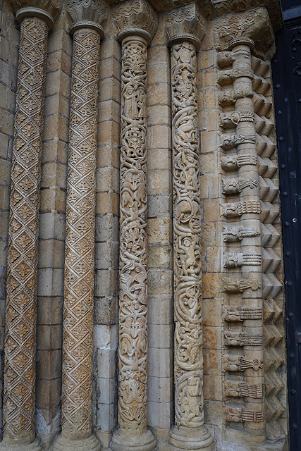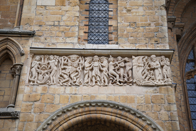 不知為何,主立面的幾座大門都沒「審判之門」華麗,僅有中央邊框併組了不同花樣,以圖騰、人像、奇特臉譜串出趣致,並於橫楣加綴一排戴冠王者。兩邊柱面的帶式浮雕反倒吸睛,尤其是左邊,據說為諾曼時代的作品,能見地獄惡魔吐舌瞪眼,警示信徒莫做壞事。然而,這風格會不會太逗趣了,拉扯頭髮像在嬉鬧,噬咬下體應是懲治姦淫,望來也讓我噴笑,在中世紀真的能發揮效果?