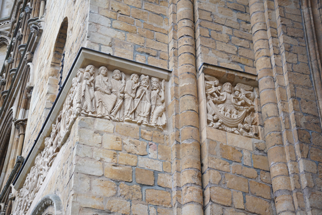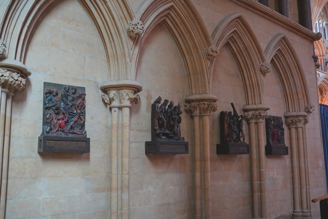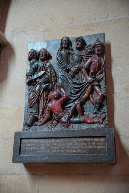 沿途牆上尚有些受難雕作,耶穌被捕時,彼得拿匕首相抗的畫面很是惹眼。鄰近石座標示的「Little Hugh」亦引人好奇,讀了一下,居然是十三世紀莫名死亡的小孩。當年以訛傳訛,帳便賴在「林肯」的猶太人身上,搞到近百人被抓,十八個處以絞刑,足見宗教造成的仇恨力有多可怕。奇的是這小孩也被當成聖人了,拜訪「St. Hugh」的信徒們會順道幫「Little Hugh」唸禱,而碑塚在被「內戰」破壞前,其實曾有著精雕的尖拱飾綴。