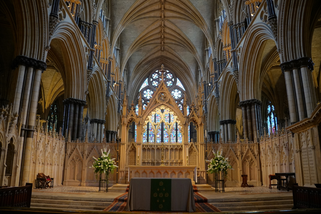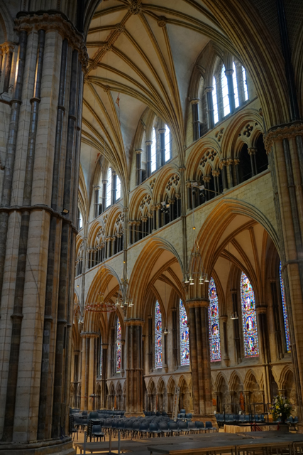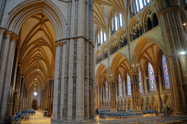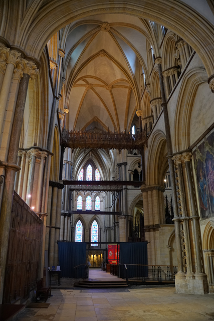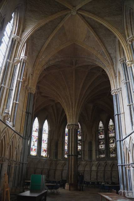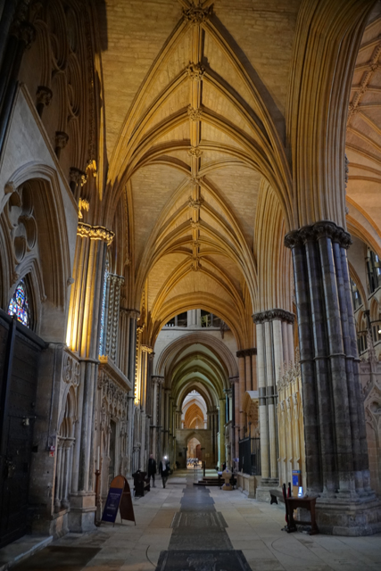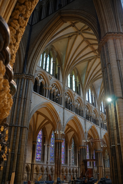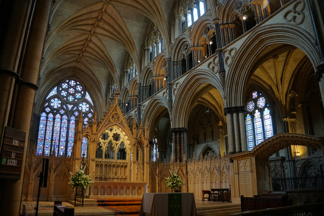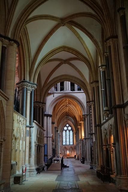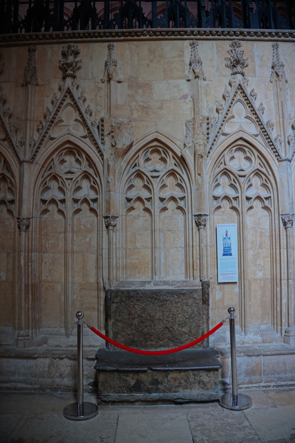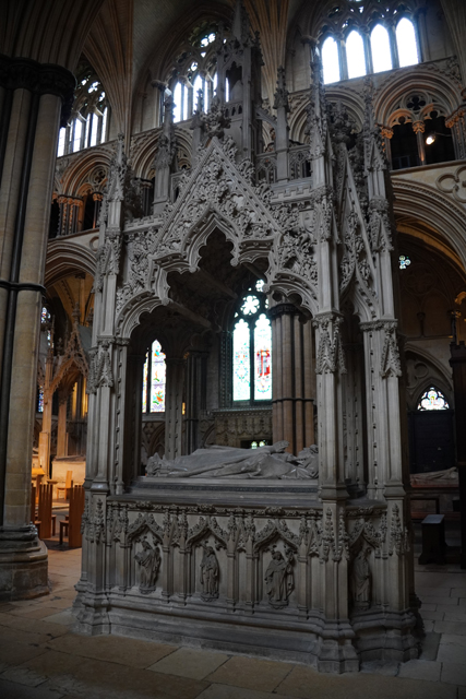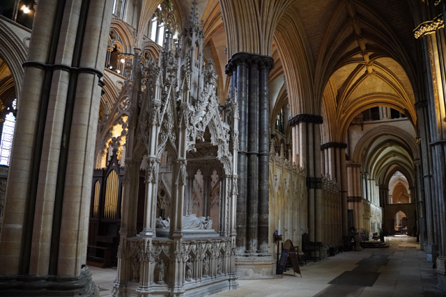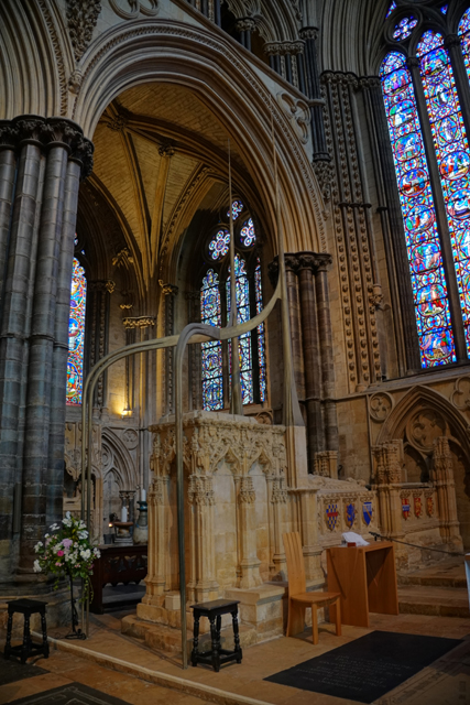盯瞧過後環望周邊,靠北有座顯眼墓塚,繁雕頂尖拉得飛竄,但根據介紹書,裡頭只是位近代主教,用簡單石桌標記的那處反倒重要。它追念著十二世紀的主教「St. Hugh」,當時教堂曾因地震幾乎全毀,是在其任內以哥德式獲得新生。據說這人正直,敢對「理查一世」及其弟「約翰」提出諫言,完全無懼他們父親「亨利二世」曾怒殺過「托馬斯·貝克特」。也樂於施捨、照顧窮病,遇到無名屍會幫入葬,因此當他死後封聖,不僅主唱詩班席以之為名,尾堂亦長闊重砌,以奉置他的遺骨。