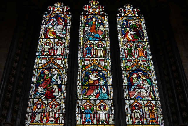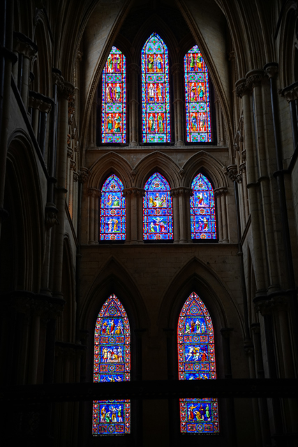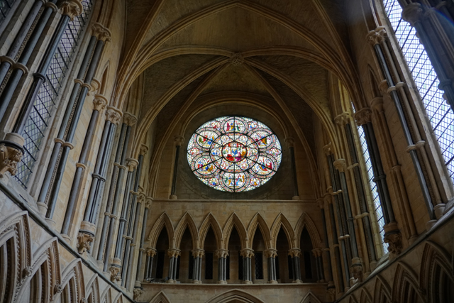 自然也把握時間瞥向南北翼廊,這兩處有知名的玫瑰花窗,北側的名為「院長之眼」(Dean’s Eye),是從十三世紀遺下的珍貴古物。核心窗櫺呈四葉草形樣,聚焦在基督的再臨與最後審判、各樣的死亡及復生,因此能看到聖母的去世和「St. Hugh」的葬禮。周邊則是天使捧著刑具、荊冠跟十字架。但可能太早期了,就算事後找了高解析圖片,略簡的輪廓仍逼人運使想像力。