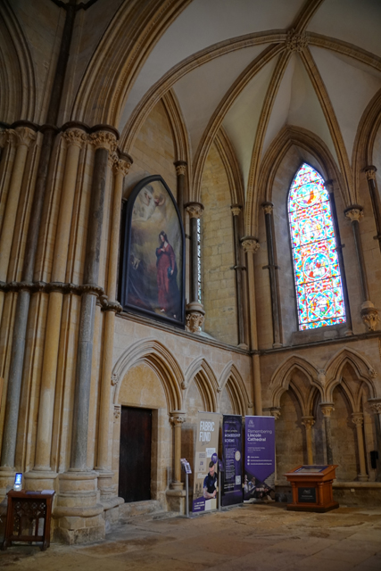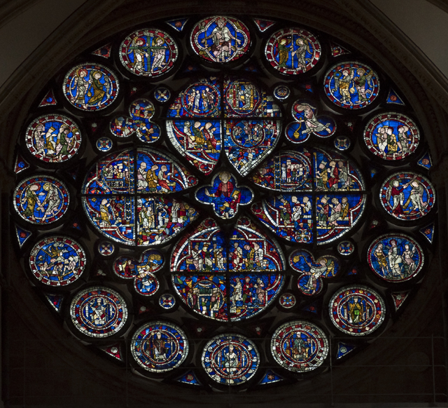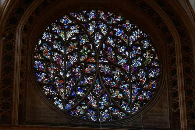 南側的被以「主教之眼」(Bishop’s Eye)稱之,窗櫺是挺少見的併排雙葉。可惜玻璃在「內戰」期間被破壞了,目前所見的為十八世紀的重新拼組。據說早年認為北方是撒旦之地,南方為聖靈所處,故以「院長之眼」守望拒退,「主教之眼」迎入喜樂。而在這短暫的對眼,好像也真能接收這樣的寓意,葉脈間的色塊斑斕著,雖曾碎散,仍爍閃著希望。