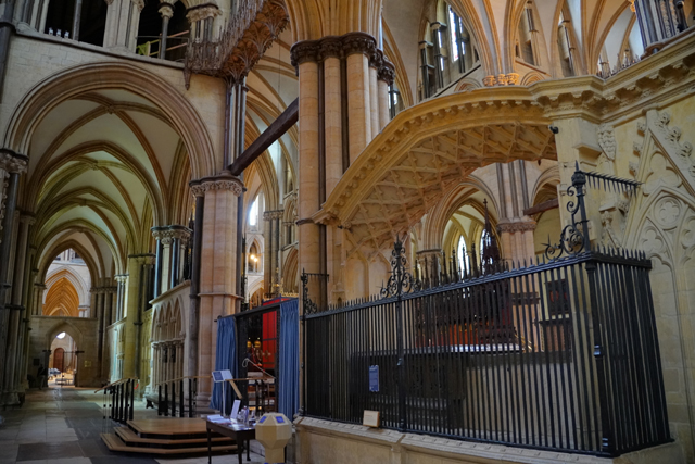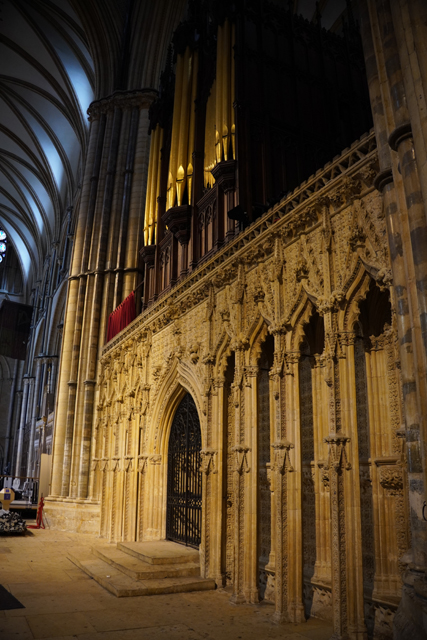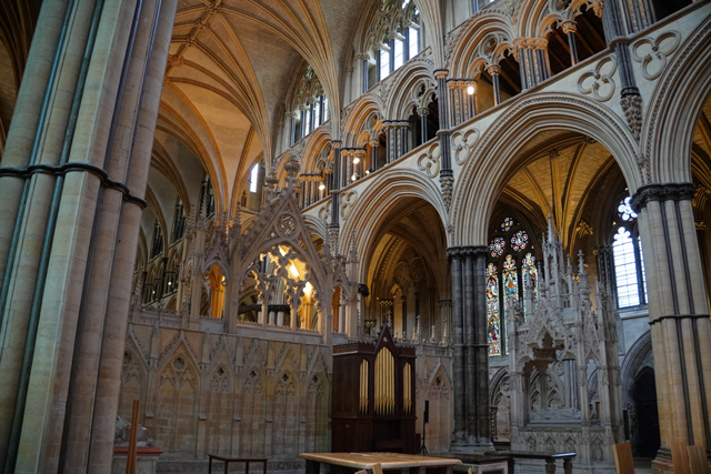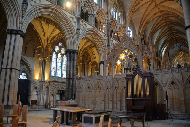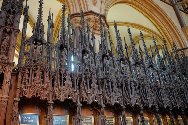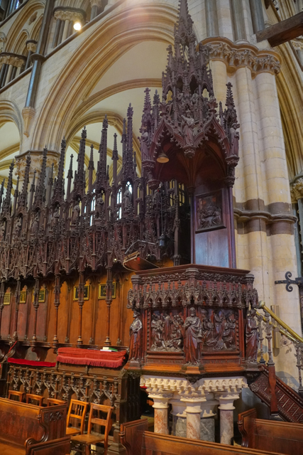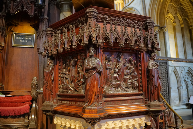 這個「St. Hugh’s Choir」不愧教堂的位階與歷史,哥德式的雕鏤相當精緻。嵌著人像的尖冠連綿,在中央管風琴處挑飛成峰。儘管木色晦暗,金色管柱及藤捲懸燈卻帶來輝亮。南端再砌的主教座席自然是最華貴的,有飾柱為襯,耶穌在頂守望。於北端相呼應的講道壇亦不遑多讓,添附了敘事圖刻。
