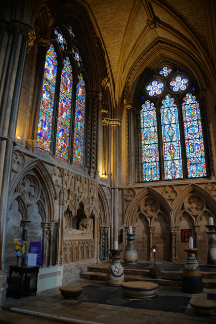 待了許久,出來沿壇外迴廊走,北側末處是「Burghersh Chantry」,裡頭棺塚皆為這主教家族所屬。地面散置的燭台滿特別,宛如帶著彩紋的大型瓶碗,胖瘦高矮各自不同,說是獻給「St. Gilbert of Sempringham」的作品。