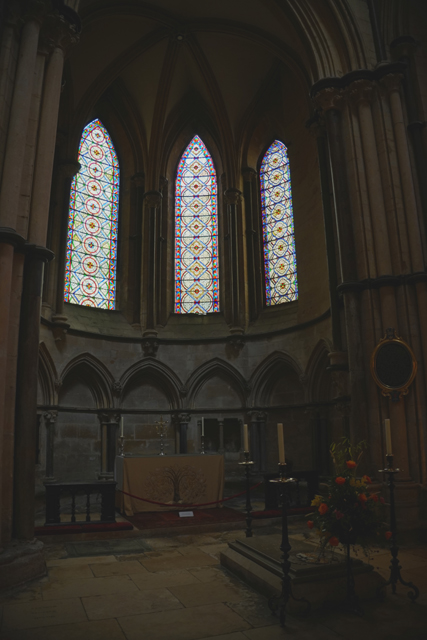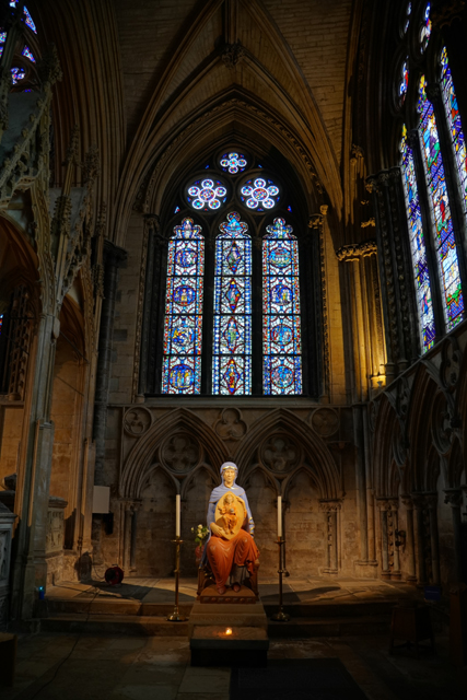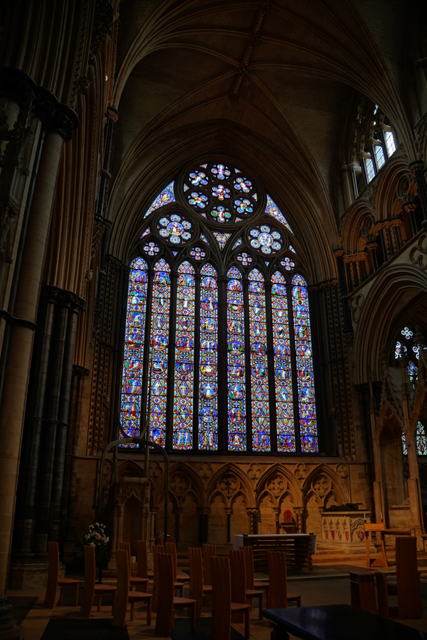 其隔壁便是尾堂東末了,設有另個較陽春的唱詩班席「Angel Choir」跟「St. Hugh禮拜堂」。不由得抬頭望向東花窗,當年它可是第一個八列的大型哥德窗,雖然玻璃彩繪多已被換替,仍不減其身價。辨了一下,在其中能找到亞當、夏娃、摩西這些舊約人物,也能瞥見滿多耶穌場景。排列順序卻看不出邏輯,難道是補來補去就亂了?