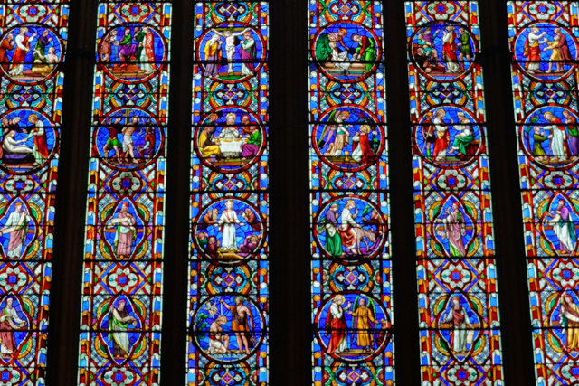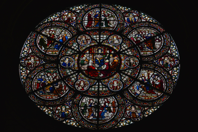 走了進去,或許是因提早迎客,燈還未開,但窗光已映顯其中柱結構,肋線如泉噴湧,再轉星芒。環望後不禁將視線落在繽紛窗花,圓形主窗疑似主教群,周邊的偏向教堂歷史。