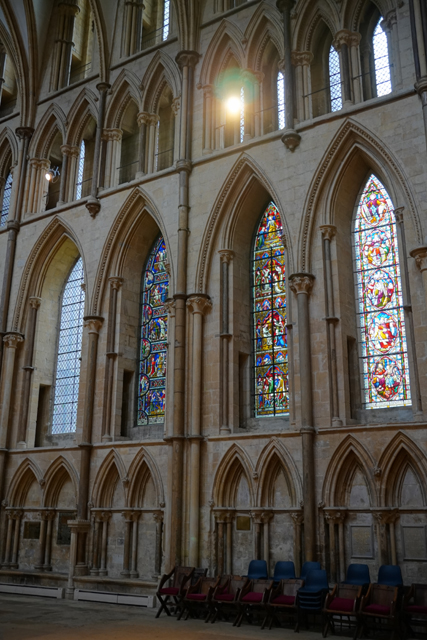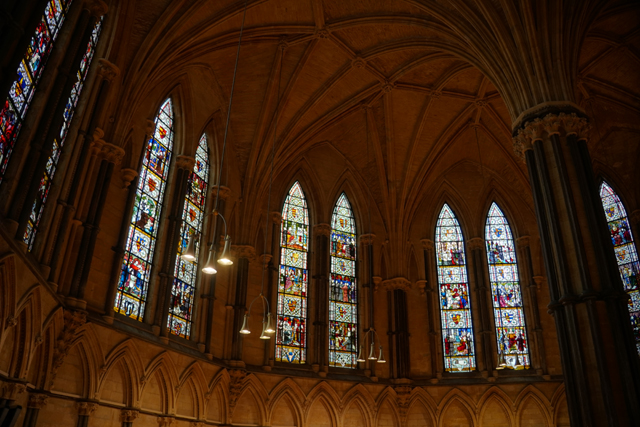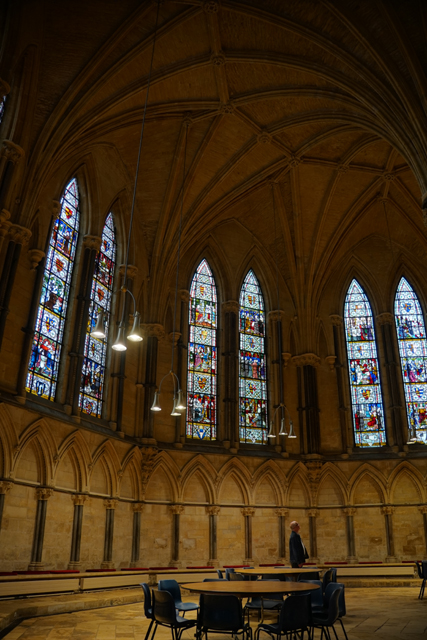 這廳一般是牧師每日開會所在,但根據入手的介紹書,它不僅為每任主教的推舉處,也是「愛德華一世、二世、三世」召開議會的地方。「聖殿騎士團」亦曾在此被審判,而後強制解散。然窗花這麼多幅,也只有參加導覽才能知曉是怎樣的對應。此外,窗下尚有個重要古物,即那張曲弧頂蓋的木質大椅,它可是當初的主教座席,七百歲的老爺爺呢。