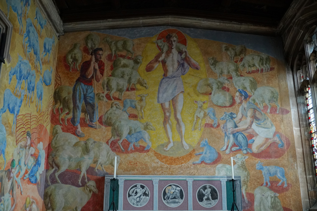 據說教堂各處藏了不少類似這樣的彩蛋,然雨天使堂內更顯昏暗,沒指引要靠自己再尋出個寶也挺難。在四望中探著東南翼廊、鄰近的「Russel Chantry」,後者由於同時獻給羊毛業的守護聖者,且羊毛在中世紀可是「林肯」的主要收入,特別添繪了工作場景。