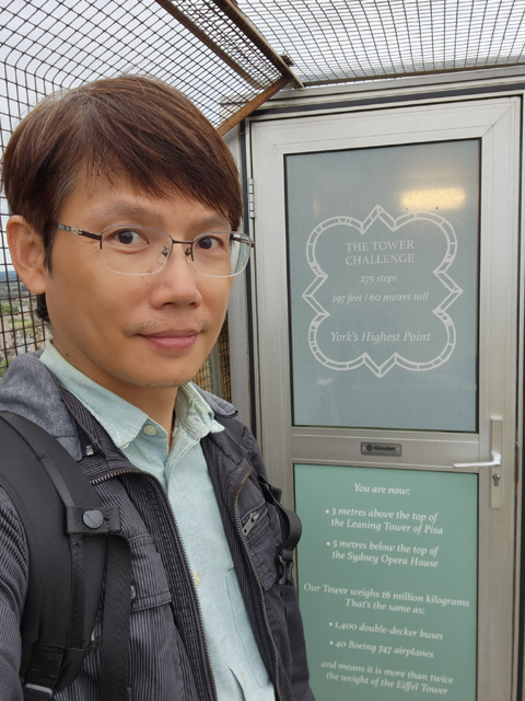 持續擠著腎上腺素,忽略雙腿的抗議,終於我從密閉梯間再次見到天光。門口看板在嘉許之餘,特別點出這兒比「比薩斜塔」略高,但印象中,當初爬那座還滿寫意啊,果然年紀是致命傷。