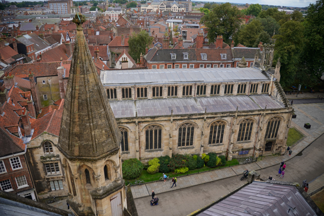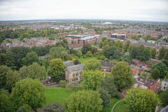 儘管費勁爬了上來,由於怕人自殺,周邊煞風景地全是鐵網,只留一個個小洞讓相機探出頭。自然先把目標指向西雙塔,之前覺其高聳,現在竟將其逼於眼下。盯了一陣細碎的尖錐框飾,我將視線投遠,在雙塔間能找到稍早快閃過的「聖瑪麗修道院」。隔著茂密林樹,隱隱有鐵路劃掠,鄰近長屋棚下的應就是知名的「大英鐵路博物館」了,展示的火車超過三百,規模據說是世界之最。