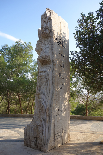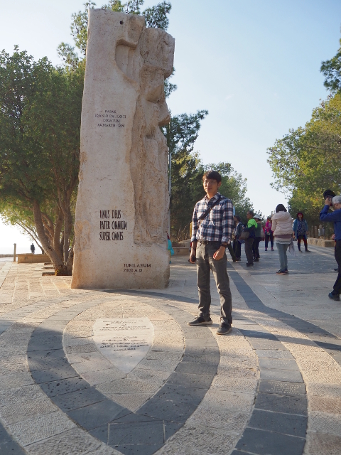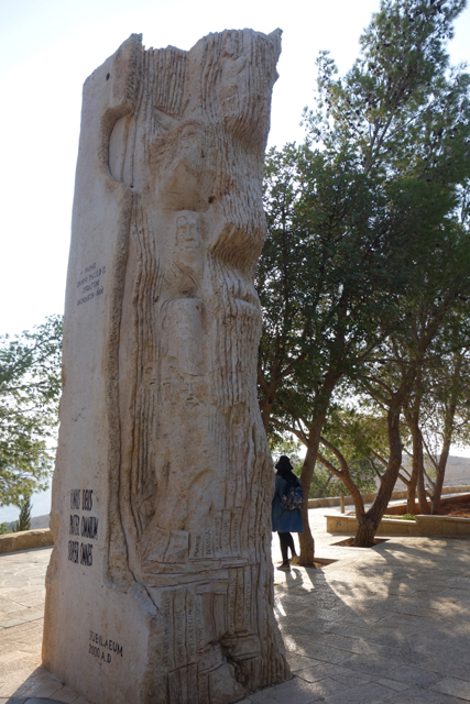 下了車,步道立了一根模樣挺特別的碑柱「The Book of Love among Nations」,紀念教宗「若望保祿二世」在公元兩千年的到訪。它半側光滑、半側嶙峋,遠看像老者的側臉,近觀的紋理呈書頁,當中有著人臉疊嵌,似故事主角的情緒搬演。不過根據資料,書頁其實併合了妥拉、聖經與可蘭經,也就是期望「猶太」、「基督」、「伊斯蘭」這三個同源宗教能和平相處,永無紛爭。