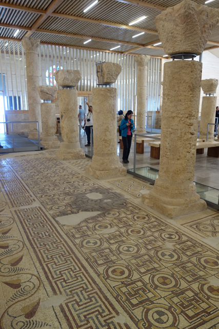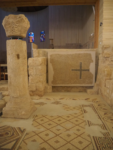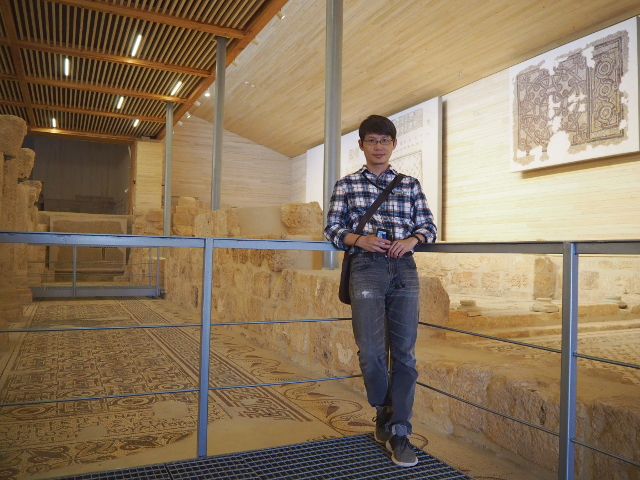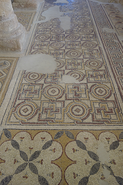 與其相鄰的另間是「Chapel of Theotokos」,「Theotokos」為東正教對聖母的稱呼,祭壇位置有兩根短尖柱,不曉得是壇桌的殘遺或啥別的物事,壇前在羚羊互望中,拼繪了一棟小建築,可惜已殘破到難以辨認身分,缺失嚴重的尚有廳中的狩獵圖,很令我懷疑是有心人士的破壞。因此,能端賞的只剩配襯於旁的圖騰了,有菱形的拼花及迷宮狀的轉折,此外還有挺別緻的框邊,它似彩帶拋擲後的翻騰,不同色階疊出的立體感相當逼真。
