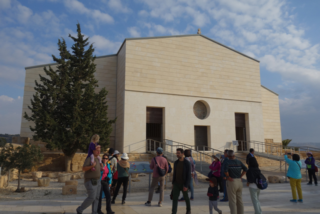 循路往前,旁側又有一塊超大的豎立圓盤,標牌以「The Abu Badd」稱呼,不知是譯自哪地方的語言,簡介寫著它原位處鄰近村莊的修道院,是防禦用的封門滾石。這很令人疑惑,那個年代有這麼險惡嗎,還是因穆斯林鐵騎長年肆虐,連修道院都得用上如此堅實的防衛?不禁趁著拍照時伸手偷推,果真紋風不動,這也挺合理,既敢立於此,就已先預防了我們這種手賤之人。玩鬧之際,視野也出現一棟教堂,底牆堆石古樸,上段疊合的卻嶄新,尾堂延伸舊時輪廓呈弧圓,頂簷則斜向交錯切劃,為現代喜好的簡練。這就是「摩西紀念堂」(The Memorial of Moses)了,正向的門面在另端,得從旁繞去。