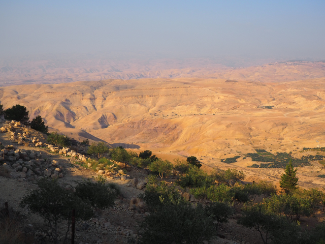 這條走繞的步道同時也是展望台,據說神雖禁止摩西進入「應許之地」,仍感念其辛勞,引他攀上此山,在生命終結前以眼確認這一路的冀求追尋。一塊圖板貼心指了死海方位,循線找去,據說可以望見背側的「昆蘭」、更遠的「耶路薩冷」和「伯利恆」,稍往右偏,則有較近的「耶律哥」。可惜今日雖晴,遠方卻一片霧濛,即便努力辨識,連死海的水色都沒找到,遑論更遠的聖城了,能見的就是山下連綿的荒丘,幾簇依附在綠洲的小村莊。是有種遼廣的空寂,讓人感懷天地之闊,也有種舒朗,誘人御風飛翔,不過對一個帶著無數子民,由埃及遠道而來的領袖,恐怕不免有些失望吧?還是,當年的氣候景貌其實不是這樣呢?也或許再行過腳下這片荒野,真有茂原淙川,流著奶與蜜。